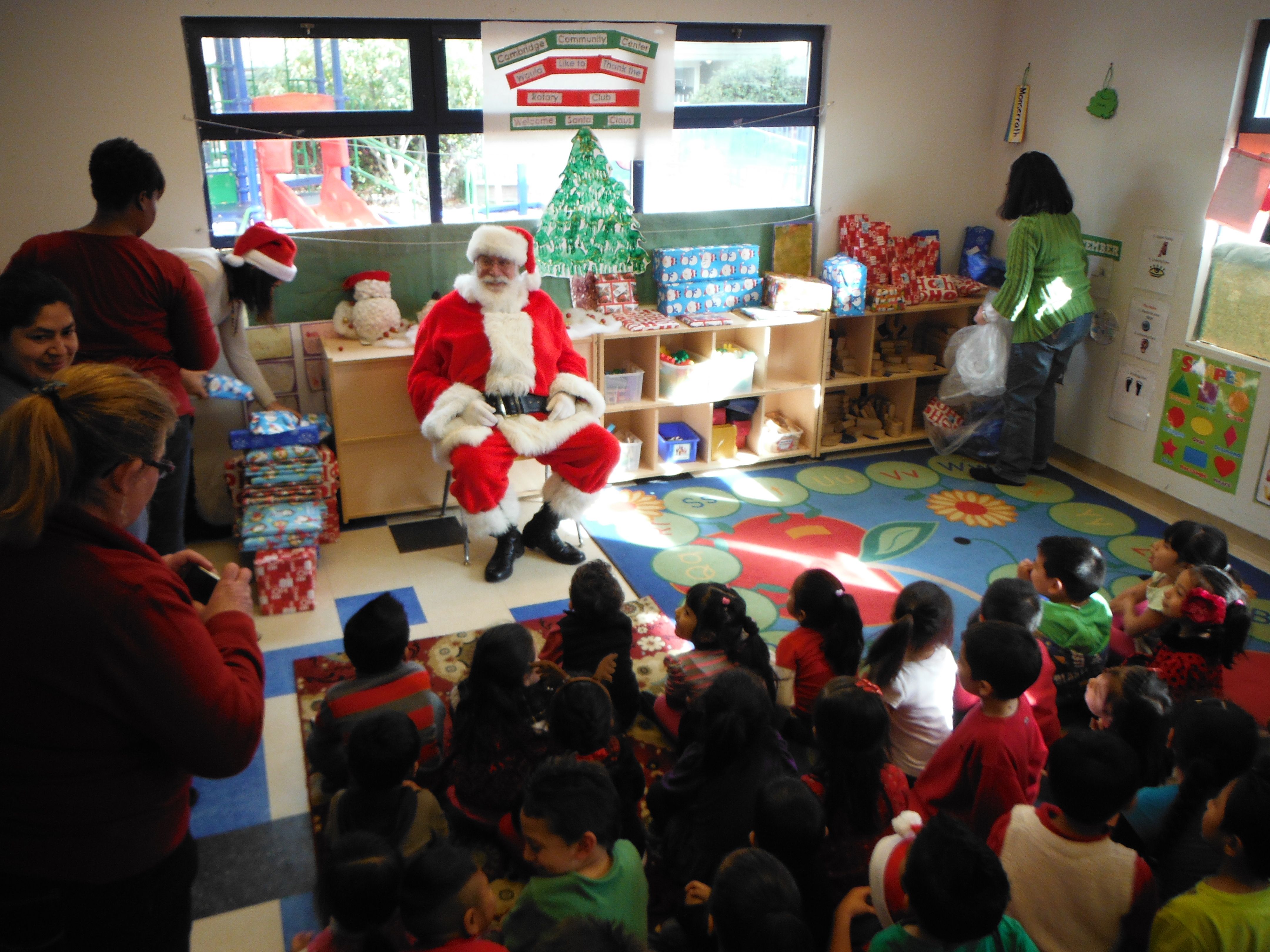 Next, it was off to give the gifts away. You would not believe how well-behaved 3-4 year olds can be when Santa is in the house! After the gift exchange, it was back to the secret room for a delicious lunch! As is tradition, we donated the money we would normally pay the hotel to Cambridge.